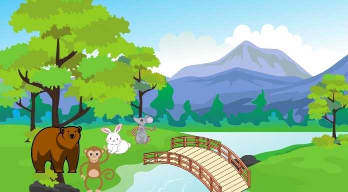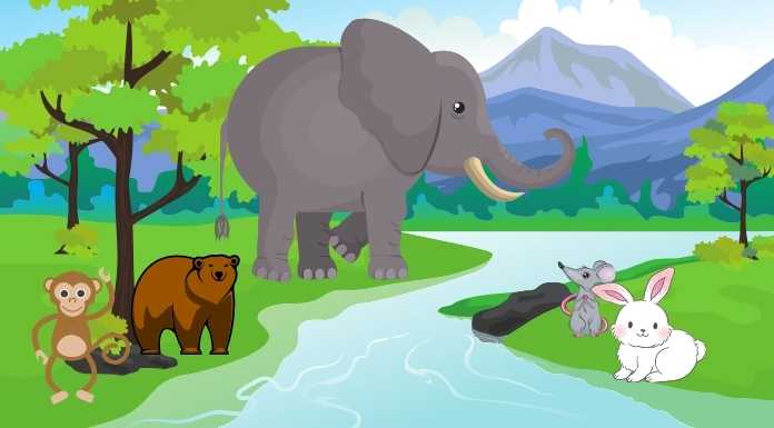 ณ ที่แห่งหนึ่ง มีแม่น้ำสายเล็กอยู่ในป่าใหญ่ แม่น้ำนี้ไม่กว้างใหญ่นัก ลิงน้อยกับหมีน้อยสามารถกระโดดข้ามไปได้ แต่กระต่ายน้อยสีขาวและเจ้าหนูน้อยกับไม่สามารถข้ามไปได้ เพราะว่าตัวของพวกมันนั้นเล็กเกินกว่าที่จะโดดข้ามลงไปในแม่น้ำ และมักจะเก้ๆกังๆอยู่แถวริมน้ำเป็นประจํา