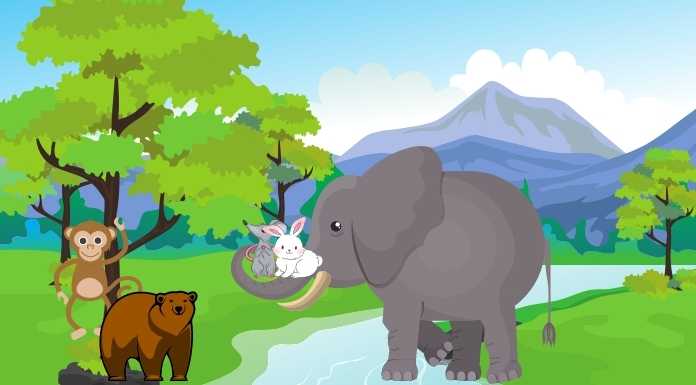เมื่อเจ้าช้างมาเจอเข้า จึงคิดในใจว่า เมื่อสัตว์ตัวน้อยเหล่านี้ต้องการความช่วยเหลือ ฉันควรช่วยพวกเขา ดังนั้นมันจึงใช้จมูกยาวๆของมันพันเจ้ากระต่ายกับเจ้าหนูข้ามไปยังอีกฟากหนึ่งของแม่น้ำ
