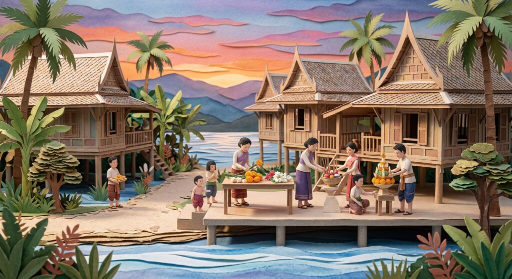 หมู่บ้านเล็กๆ ริมน้ำเริ่มมีชีวิตขึ้นอีกครั้งเมื่อค่ำคืนใกล้เข้ามา บ้านไม้ยกสูงเรียงรายอย่างเรียบง่าย ผู้คนในหมู่บ้านต่างเตรียมเครื่องบูชาอย่างตั้งใจ มือที่หยิบจับดอกไม้ ธูป และเทียน ล้วนเต็มไปด้วยความเคารพและศรัทธา เด็กๆ วิ่งเล่นเงียบลงกว่าทุกวัน ราวกับรับรู้ได้ว่า คืนนี้ไม่ใช่คืนธรรมดา