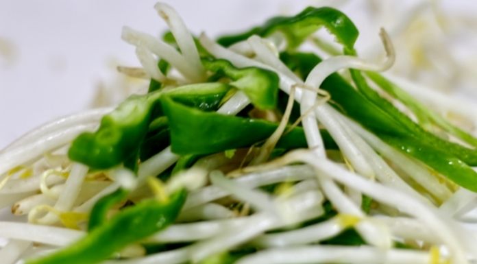 4.เมื่อตับเปลี่ยนสี ให้นำใบกระเทียมและถั่วงอกลงไปผัดพอสุก
