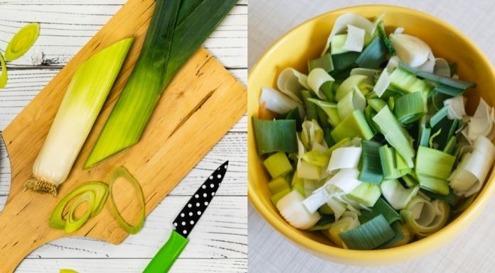 3. ต้นกระเทียมนำมาทุบหัวก่อนหั่น ควรแยกต้นกับใบไว้ต่างหาก