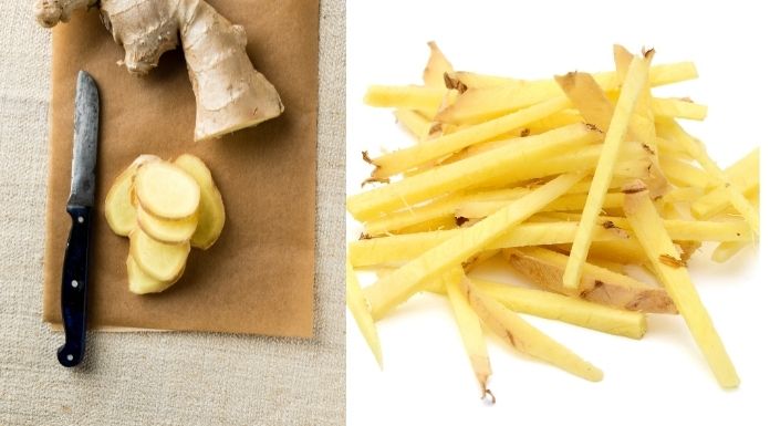2.นำขิงแก่ล้างให้สะอาดแล้วหั่นเป็นฝอย โดยแบ่งเป็น 2 ส่วน ส่วนแรกใส่ลงไปที่ตับหมู เพื่อดับกลิ่นคาว อีกหนึ่งส่วนเตรียมไว้เพื่อผัด